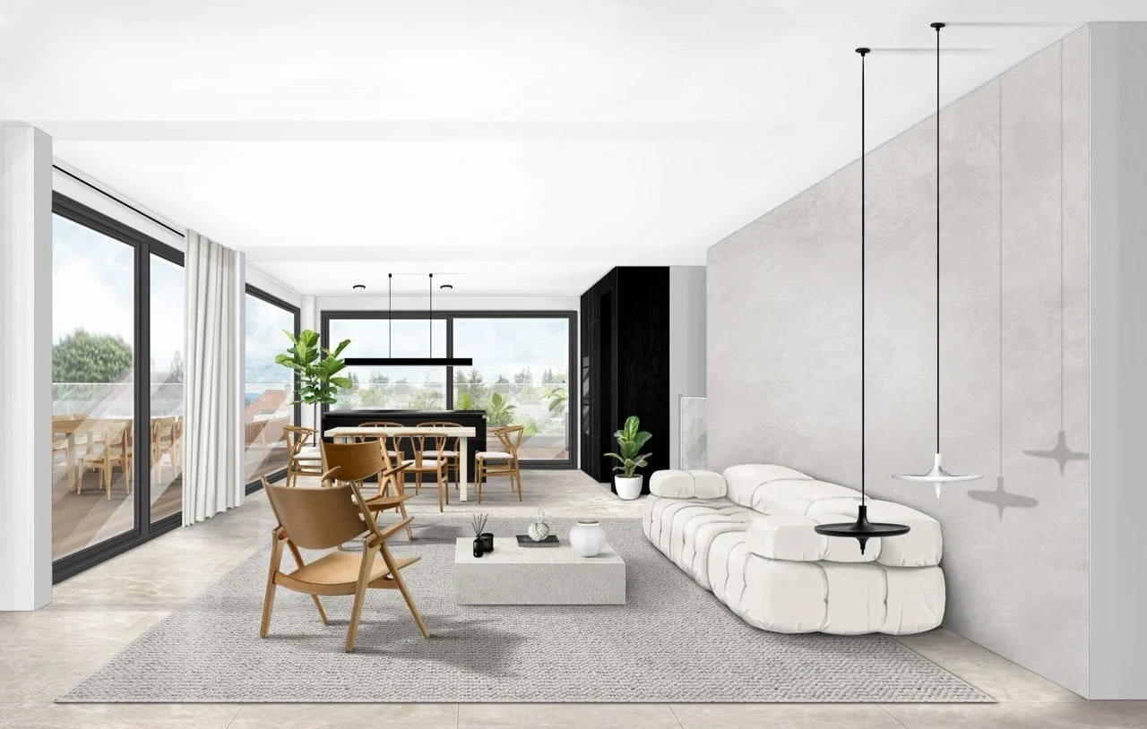 Following the desire to refurnish his apartment in a new style, GR assisted the client in designing a bright, modern furnishing concept in neutral colors for the entrance, living spaces, and balcony of his spacious penthouse.